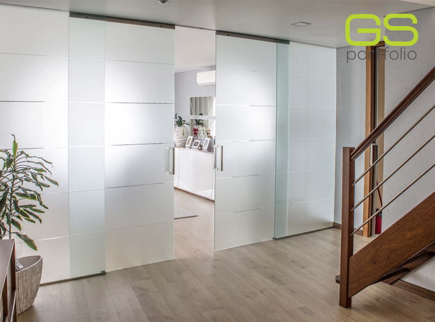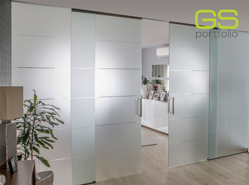Portas com vidro fosco com 5 rincões. Duas portas fixas e duas portas de correr.