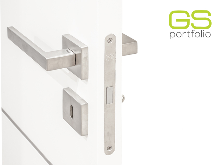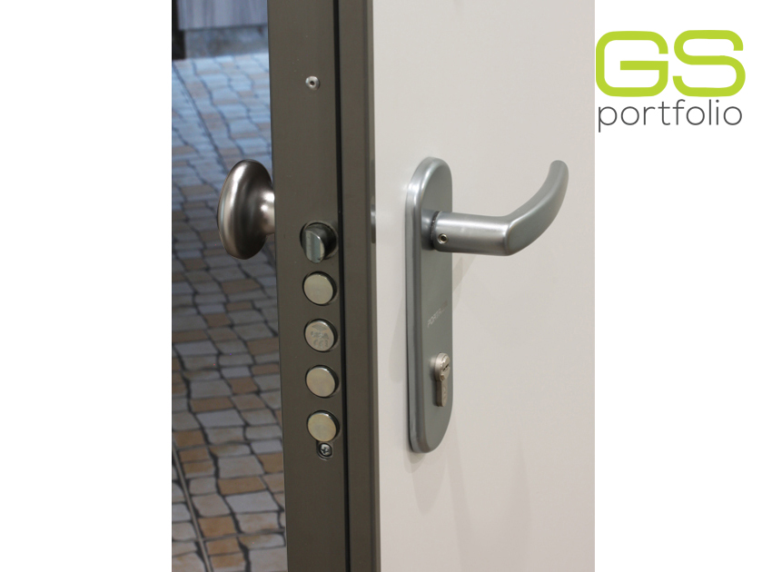 - Porte battante GS DOORS, modèle PLUS (jusqu'au plafond), en laqué blanc mat avec coins. Serrure magnétique.
