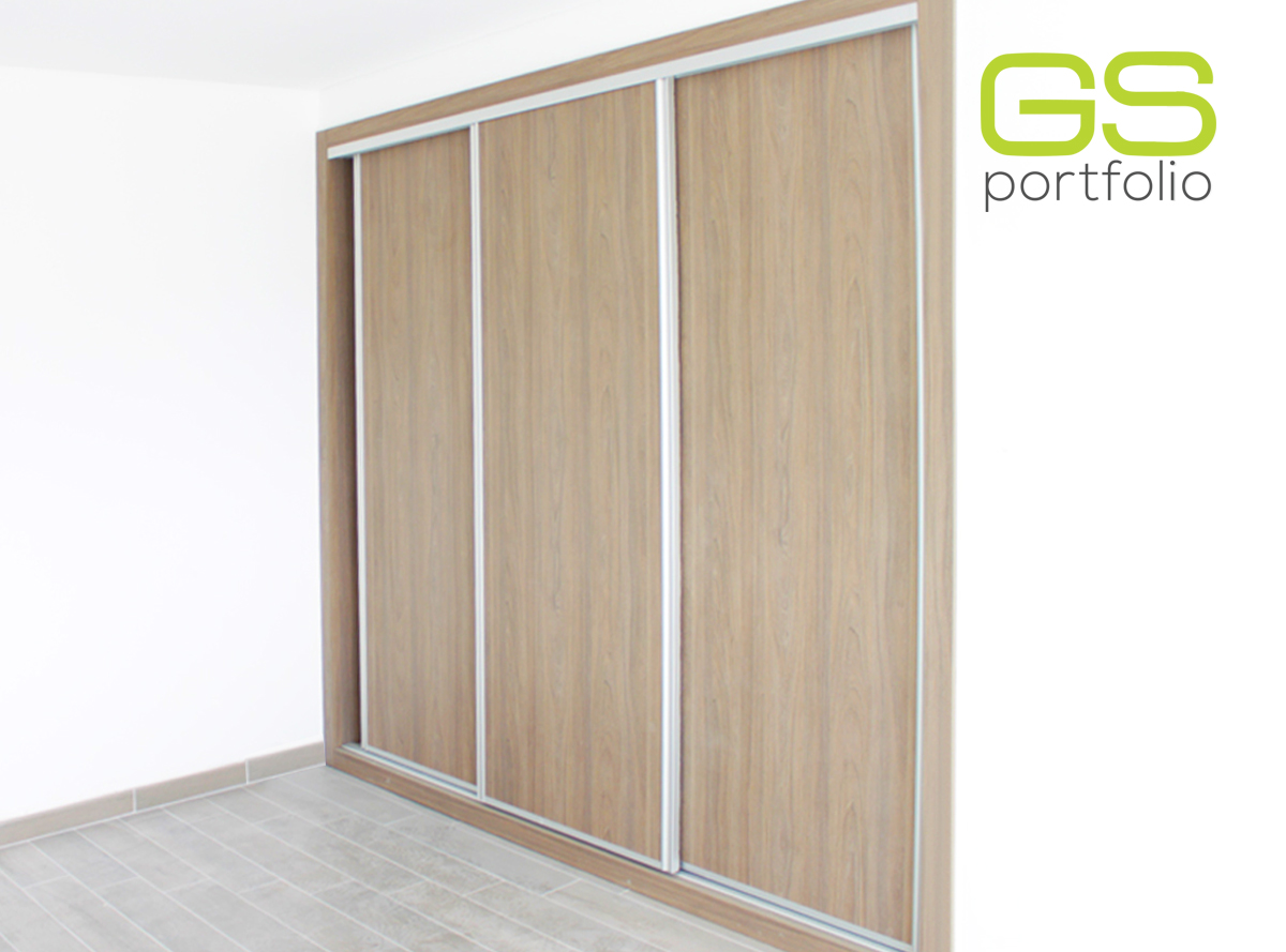 - Placard encastrée GS CONCEPT avec 3 portes coulissantes. Feuille de vinyle : Olmo Taupe et profil latéral poignée en aluminium.