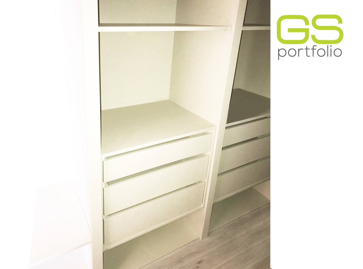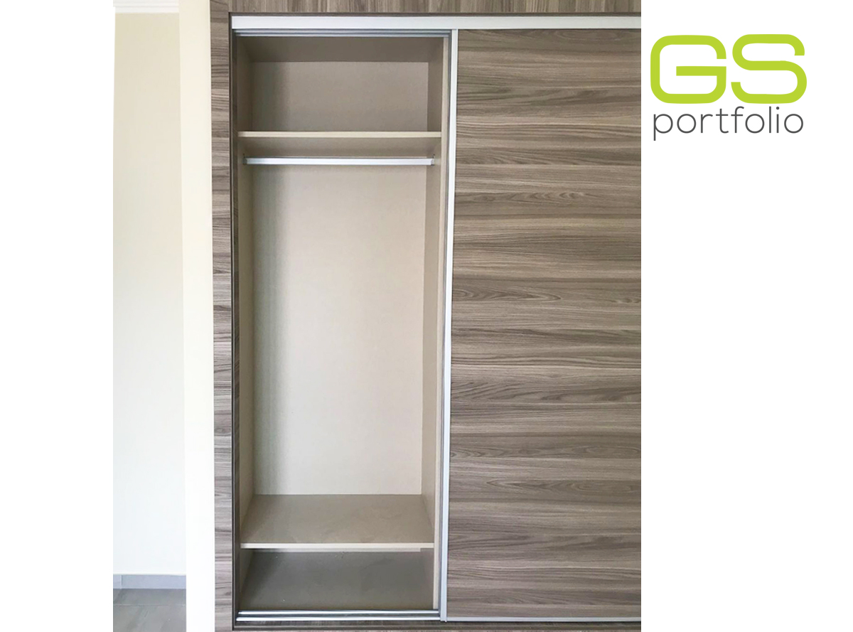 - Placard encastrée GS CONCEPT avec 2 portes coulissantes. Feuille de vinyle : Olmo Gris et profil latéral poignée en aluminium.